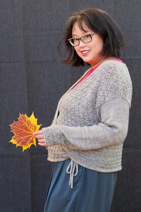 CLAIRLEA is a cozy wrap sweater, worked seamlessly from the top down, with an all-over twisted stitch pattern and drop sleeves. The back shoulders and upper back are worked first, then the front shoulders are picked up and worked down to the underarm. The front and back are joined at the underarm to work the lower body. Sleeves are picked up and worked in the round to the wrist. I-cord is worked around the edges, and used for the wrap ties.