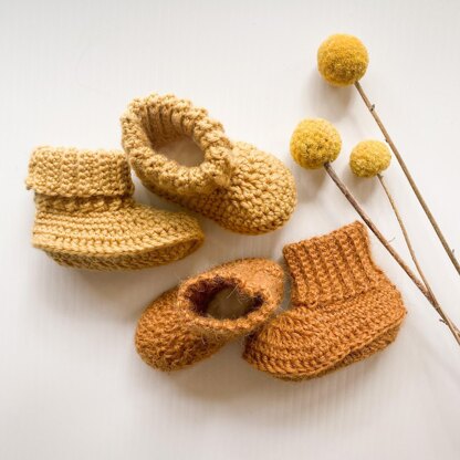 Classic booties pattern with a rib cuff, offering 2 options: long folded over cuff, or short cuff. Patterns offers: Newborn size in both 4ply (fingering) and 8ply (DK) 1-3 months in 8ply (DK) 4-6months in 10ply (Aran)