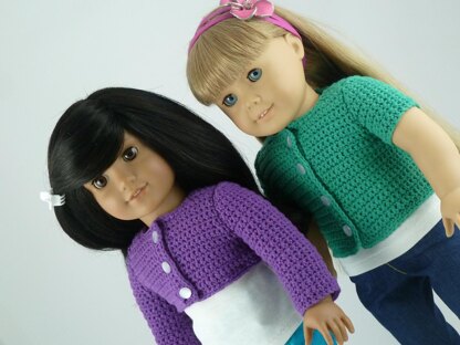 Even dolls need a few basic cardigans in their wardrobe. This simple yet stylish cardigan can be customized to fit your doll's unique style! This cardigan is perfect over sleeveless tops or dresses. This pattern was made to fit the newer body-style American Girl dolls, the chubby pre-mattel American Girl dolls, and other 18 inch dolls. Customize for a full-length or cropped bodice, and long or short sleeves.