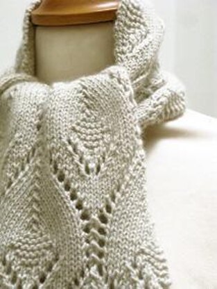 The gently curving side edges on this scarf are created by a combination of yarn overs and double central decreases which create the lace motifs. Originally knitted in a worsted spun 100% cashmere yarn the scarf is worked in two pieces so that the pattern travels from the ends towards the centre and then grafted using Kitchener stitch. A lightweight but luxuriously warm design which would make a perfect gift worked in any DK weight yarn.