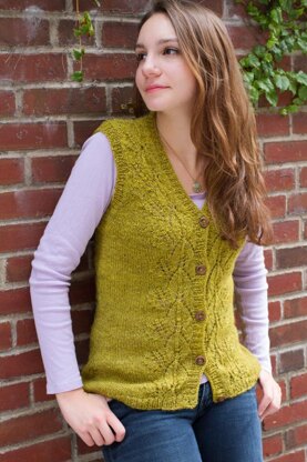 This garment is worked from the bottom up in one piece to the armholes; the fronts and back are then worked separately while shaping neck. A 3-needle bind off is used to join the shoulders. Stitches are then picked up around the armhole and worked in ribbing. The buttonhole, neck and button bands are worked on one long needle. Blocking and sewing on buttons completes this stylish vest.