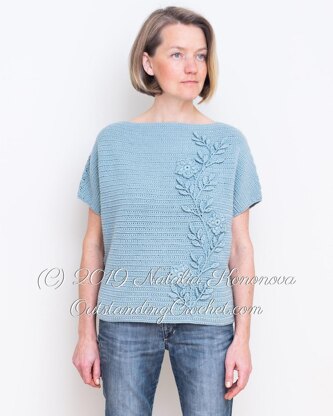 Prototype: Cotton Fair by Premier Yarns (Fine / Sport / #2 weight, 52% cotton, 48% acrylic, 317 yds / 290 m / 3.5 oz / 100 g) in Succulent color 5 (5, 5, 6, 6, 7, 7) skeins / 420 (430, 490, 550, 600, 640, 690) g / 1332 (1364, 1554, 1744, 1902, 2029, 2188) yds