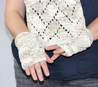 This scarf set is made with a cushy, soft bulky yarn so knits up quickly. Uses basic knitting stitches.