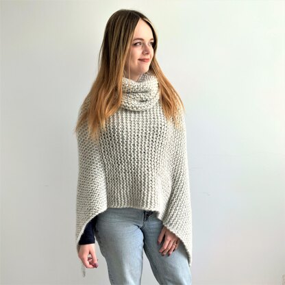 A very warm, chunky, poncho to wrap up in, for that walk by the sea! Wear it one of two ways – with points at the front and back, or on the sides. Plus a matching cowl, for extra warmth.