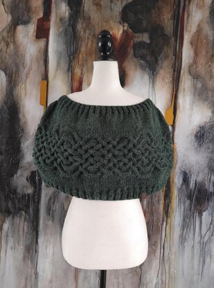 This capelet is the perfect blend between capelet/poncho/sweater! With it's beautiful celtic middle section, its fit is roomy like a capelet with beautiful sweater detailing! It showcases a traditional Celtic cable section around the complete middle section with classic solid stockinette stitch back at top and bottom. Darts knit int the top section allow the capelet to hug your shoulders nicely. So versatile, it looks great with a blouse, cami or t-shirt underneath!