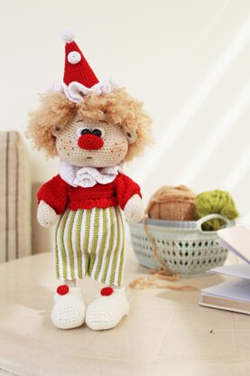 Crochet CLOWN toy pattern is in PDF format in English (US terms) language. Crochet level: medium The pattern consists of 26 pages and is accompanied by more than 50 photographs. The finished product using the materials stated in this pattern is ~12.5 inches / 32 cm in height without the hood. The doll is crocheted as one piece with the wireframe. It can move the legs and arms. The eyes, nose, and ears are sewn only. All clothes are removable. The pattern includes the doll + set of clothes (cap, T-shirt, pants and boots).