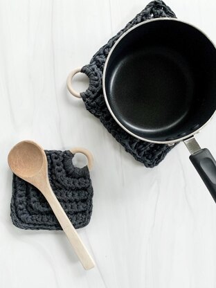 The Presina Coaster + Trivet set features a unique ribbed texture and a bamboo ring attached in the corner making this set modern and functional. Worked diagonally and with simple stitches, this set is worked horizontally to easily customize the finished size. Perfect for housewarming + teacher gifts, whip a set up in no time! Fun fact: Presina means "pot holder" in Italian.
