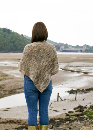 Inspired by the coast, this shawl resonates with waves in the sea, ripples of sand on the beach and pebbles on the shore. Worked sideways, starting at a point and increasing along the neck edge, the pattern uses a mixture of tall and short stitches to create waves. Made on a large hook the shawl has both drape and texture.