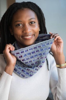 Cobblestone Cowl is a fast and fun project. Using two colors – one a tonal and one a variegated, and working 2 rows at a time with each color, you will find yourself wanting to keep adding “just one more row.”