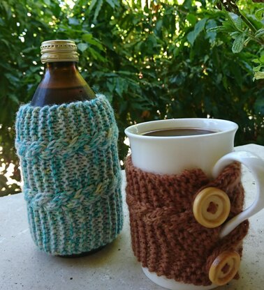 The Cofaidh cosy features a rope cable on a garter stitch background, join to form a tube or use a button closure. Adjust the length to suit the circumference of your choice of drinking vessel.