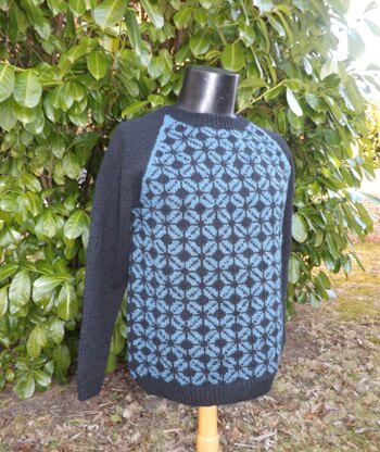 This is a sweater/pullover worked from the bottom edge and up with a 2-colored allover pattern on the body. The sweater has a raglan yoke and sleeve construction. The pattern is made for at yarn with a gauge of 18 stitches per 10 centimeters i.e. a yardage of approximate 90 meters per 50 grams. Pictured in Sandnes Peer Gynt.