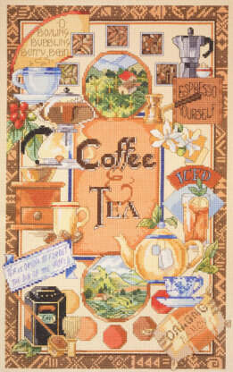 Designed by: Nancy Rossi. A display of many exciting and colorful pictures of coffee and teas. This Sampler will make your room warm with beauty.