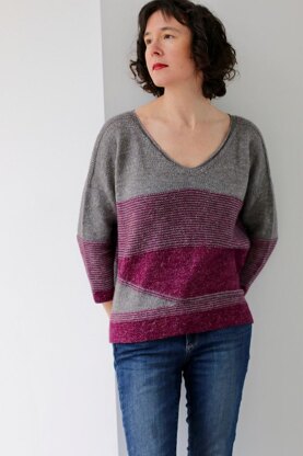 This sweater is a little bit magical; the end product looks complex and difficult to work but it’s an intuitive, fun sweater to knit! This sweater is best knit oversized and allowed to drape on the body. It’s worked in the round from the bottom up, and all the stripes are worked as reverse stockinette helical stripes, which create a seamless join. The different colour panels along the bottom are created using short rows stacked on top of each other.
