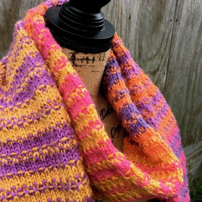 Color Drift Scarf uses slipped stitches and color changing yarn to give a Fair Isle look, but only one color is used on each row. Knit in the round, the double thickness will keep you toasty in the winter and is a perfect project for the adventurous beginner and beyond.