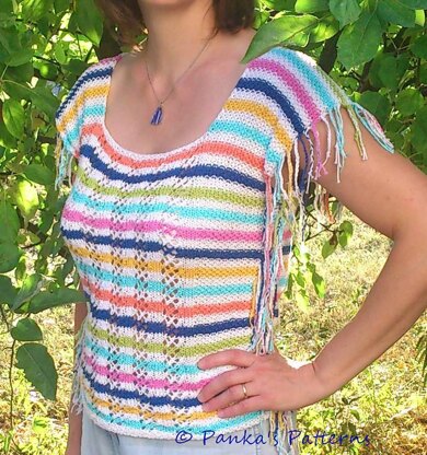 Ezt a könnyű nyári felsőt kezdőknek is bátran ajánlom. Egyszerű, haladós minta, vidám színek jellemzik. Nem kell a szálak eldolgozásával sem bajlódni, mivel azok dekoratív szerepet kapnak. A leírást egy leszámolható ábra, fotók és a használt technikákat bemutató videók teszik teljessé.