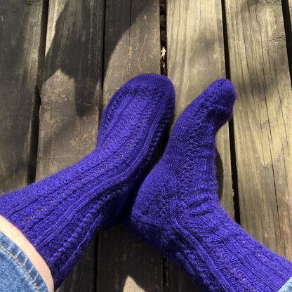 The cables on these socks were inspired by the Columbia River, the largest river in the Pacific Northwest region of North America. This pattern results in stretchy, fitted socks with negative ease to allow the lace pattern to show well. However, consider that the cables slightly reduce stretchiness when choosing your size. Charts are provided in separate documents by size.