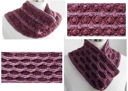 I am still in awe of two rows of Lateral Braid and have designed two Cowls combining it with the Honey Comb and Cocoon stitches. Worked flat from bottom to top, the Cowls are knit using a lighter and darker shade of the same color to contrast the textured effect and Lateral Braids. The two patterns can also be worked together as bands to make a taller cowl. The ends of the Cowl are grafted together using the Kitchener stitch.