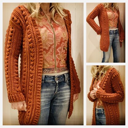 The cardigan is made sideways, so the sizes are easily adjustable. All you need to do is add or subtract a few rows.
