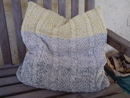 This intriguing and elegant, yet simple comfy pillow is knitted in the round. Simple cables are separated by sections of seed stitch columns. Three colors create an interesting element to the columns, working from darker shades of grey through lighter grey to add a burst of color in yellow. To allow the pillow cover to be washed, the zipper is sewn on the bottom part of the pillow case. Finished Size: Pillow is 20” / 51 cm wide and 20” / 51 cm long.