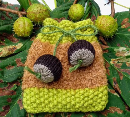 This beautifully textured bag is knitted in horse chestnut colours and resembles a conker in its prickly case. The drawstring cord is a pair of knitted life-size conkers threaded onto garden string.