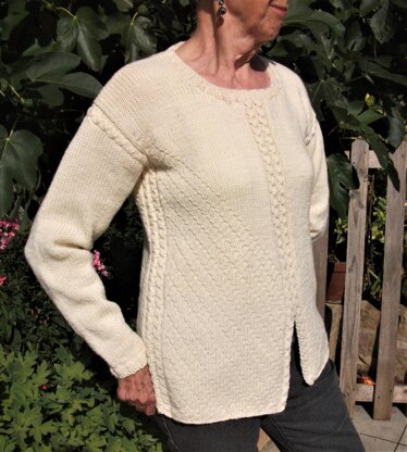 This stylish sweater has a slit at the lower centre and back which are self edged in a mock cable twist stitch - no borders to add on! The slits, together with the slanting seed patterning, add to this flattering design. The yarn used is pure wool, but would also work really well in an aran weight cotton too.
