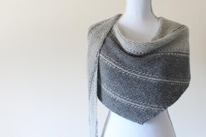 Contrail is a garter and slipped stitch shawl, knitted with two colours of fingering / 4 ply yarn. It is an asymmetric triangular shawl, knitted on the bias, increasing outwards from the top right point of the triangle.