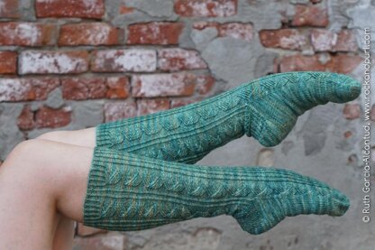 As part of the LINEAR collection these socks use mirroring and parallel lines to fit in. Being toe-up allows you to decide when you want to stop - make them calf-height if you're running short on yarn, or extend the ribbing to make the cuff turn on top of a boot.