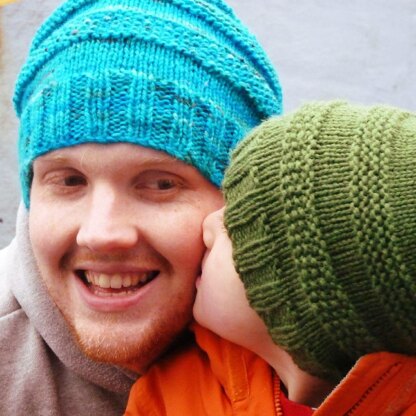 This is a slouchy hat, designed to be a fun and quick knit. It's a great project if you are just learning how to work in the round as you'll get to learn how the stitch patterns are worked differently compared to when you work flat. Why not make some for the whole family?