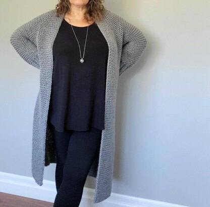The Cool Morning Cardigan has a full sleeve and falls mid calf. It features slits on the sides and a ribbed cuff. It is created in 2 pieces and sewn together. Knit with US size 11 needles using approximately 2065 yards of acrylic Aran weight yarn (also known as #4 or medium weight).