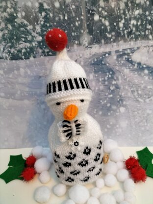 This is a freestanding Christmas Decoration. It is knitted in the round with 2mm double pointed needles. I have used King Cole Glitz double knit wool in Diamond white and Jet. A small amount of orange Dk for the nose. The hat has a felt pompom and the snowman has a bow tie and a snowflake button .Some knowledge of knitting in the round is required for this pattern. The snowman stands 16cm tall without the snowmans hat.