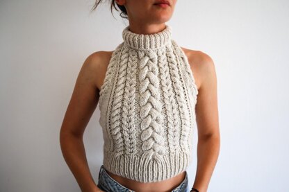 This sexy little sweater is the perfect piece to take you from Fall to Winter. Intermediate knitters will love the bottom-up construction and simple cable details. All you need is a pair of 4mm and 5mm (US 6 and 8) circular needles at least 24" long, your favorite worsted weight (4) yarn and a couple of stitch markers. The trendy turtle neck is actually worked flat and tied in the back, making this pattern really forgiving and easy to size. Worsted weight yarn makes it a super fast project to whip up as well!