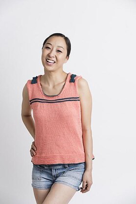 This pretty tank features knitted-in bows (which can be the same color or a contrasting color) at the shoulders, a scoop neck, and a yoke with a softly gathered “skirt” below. The skirt is edged with a sleek garter stitch border, trimmed in a contrast color. The hem is the popular high-low style. There is a gentle A-line flare.