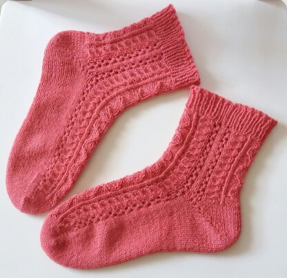 A pair of socks designed with cross stitches and cables in this beautiful and feminine coral colour. The picture shows the small size. The socks are worked from toe-up using magic loop. I used the short rows heel, but you can use whatever heel technique you prefer. You can also make them two at time.