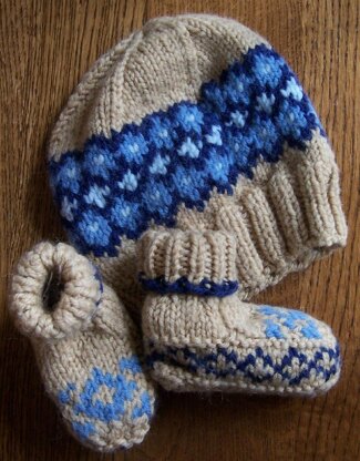For a baby girl's version, please see my Kirsty's Cap and Cuddly Booties pattern