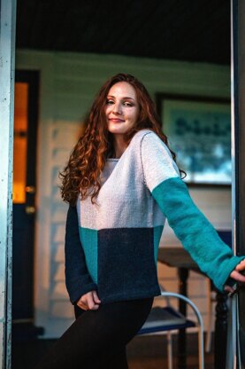 Combining light and dark shades of a neutral allow the bright color to pop in this contemporary, standard-fitting, pullover. Worked in stockinette throughout, the intarsia blocks of color and details like hem-as-you-go edges and cuffs gain all of the attention.