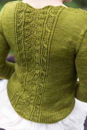 51Cosette is a sweet, lovely cardigan as fresh as spring. I named it Cosette because I was listening to Les Miserables while knitting it. It describes Cosette blooming into a beautiful young woman like the blooming flowers in the garden. The cables transitioning into lace in the stitch pattern is like flowers blooming from the cables.