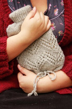 I remember growing up in Montreal with its hot summers and frigid winters. A hot water bottle really helps keep you cozy at night, especially if you have a tendency to cold feet. This comfy cover will protect you from the heat, and is nicer to the touch than rubber! The cover is styled with a turtleneck and a drawstring bottom. The chevron lace design will give the knitter enough of a challenge to keep it interesting and will make the cover pretty enough to give as a gift.