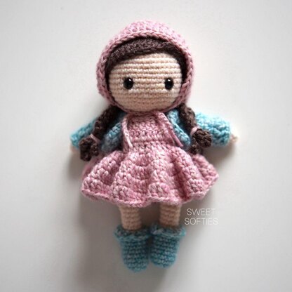 The Cottage Doll is a sweet little ragdoll made using a no-sew body base! She comes with a bonnet hood, sleeveless dress, cardigan jacket, and pair of boots. Each clothing accessory is designed without any sewing needed. They are also removable for children to have fun with dress-up and play! The only sewing that is needed for this pattern is for the hair cap to be sewn onto the doll’s head.