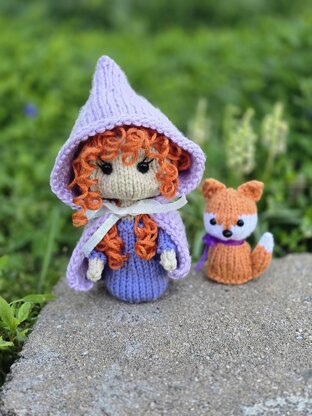 The Witch and her familiar are both constructed using Aran/medium weight yarn and US 3 (3.25mm) DPNs. The witch measures 6” tall and the fox is 3.5” tall. US 6 straight needles are used for the cloak.