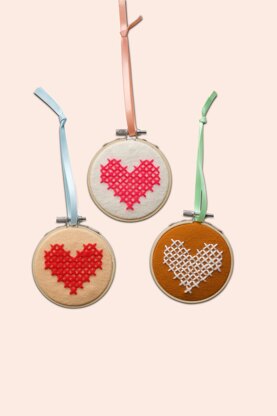 Ein Set mit allem, was du für diese Kreuzsticharbeit von drei 9-cm-Ringen mit gestickten Herzen benötigst. Dieses Set ist für Anfänger und erfahrene Handarbeiter geeignet und enthält 100 % Wollfilz, Garn, Nadel, Holzschablone, Stickstift, Bändchen zum Aufhängen, Holzrücken und Anleitung (verfügbare Sprachen siehe Produktinformationen). Die drei Herzen sind rosa auf cremefarbenen Filzgrund, rot auf pfirsichfarbenen Filzgrund und cremeweiß auf rostfarbenen Filzgrund. Da das Set eine Stickvorlage und einen Stoffstift enthält, kannst du so viele Herzen erzeugen, wie du möchtest. Dazu verwendest du dann einfach deine eigenen Materialien oder bestellst zusätzliche bei Lovecrafts.