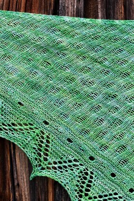 This pattern is presented in both written and charted formats, and requires only fairly basic lace stitches and increases. The pattern also includes instructions for adjusting the shawl to a wide range of sizes. And because of the unique combination of stitches used in this pattern, it works very well for yarn that's too variegated for regular lace shawls!