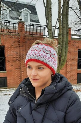 Courtney. This beautiful Heart to Heart pattern shows through on this messy bun. This style of hat is a conveninet way to stay warm with your hair up.