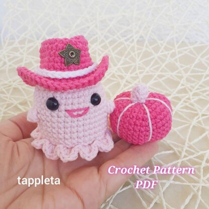 Pink Cowgirl ghost with pumpkin crochet pattern PDF. Amigurumi Cowgirl Ghost pink Halloween pattern. Car rearview mirror hanging accessories. No sew. Amazing project for pink lovers! These cute cowgirl ghost charm will be a cute Halloween small gift for kids, adults. It can be used as car hanging, as a garland on the wall, as home or outside decoration in the garden for Halloween party, Western party decoration. Size – Approximately Ghost - 2 1/3” (6 cm.), Hat - 2 1/3” (6 cm.) in diameter, Pumpkin - 1 3/4” (4,5 cm.) in diameter.