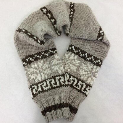 This scarf pattern has 4 sizes. Each size features it own motif, which coordinates with my other pattern Cowichan-inspired hats and mittens. The scarf is knitted in the round so the wrong side doesn't show. It works up quickly as the gauge is 3.5 sts/inch.