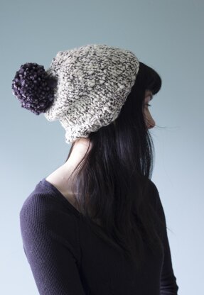 Fast, warm, and pretty! This pattern includes two versions - regular (white) and extra-slouchy (charcoal.) You can make both hats, including pompoms, from one skein of each color.