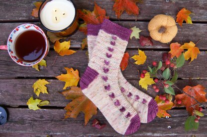 Cozy Comforts is a cuff-down sock that features a textured pattern throughout, representing a homespun or woven fabric. A vertical row of hearts hugs both sides of the sock. Pull on these socks and let them bring you a comforting reminder of the cozy things you seek.