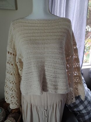 This cream simple Long Sleeve pullover with Lace design sleeve will fit over any outfit to add a layer of warmth and style. The Pullover is a seamed, drop-shoulder pullover worked from the bottom up in half double crochet in the back loop. The bottom hem, and neckline are trimmed with single crochet.