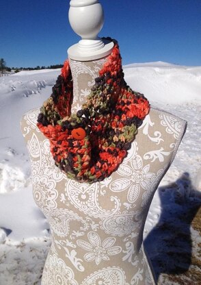 The Yarn Bee Calcutta Chunky yarn is a cotton/acrylic blend and comes in some really fabulous colors. The cotton/acrylic blend makes a pretty chunky cowl to wear when you don't need the extra warmth of a wool. Perfect to wear at the office or when out for a walk on a spring morning.