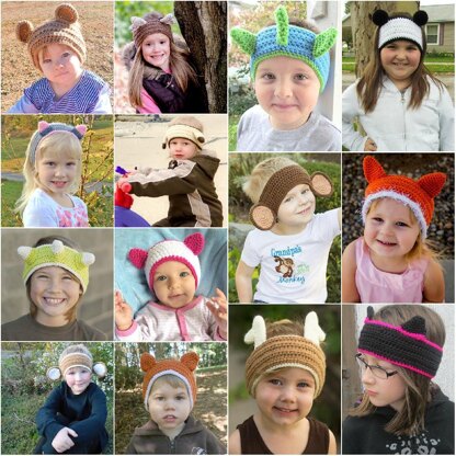 The E-Book includes written instructions for animal ear warmers in seven different varieties: monkey, cat, bear, fox/wolf, dog, deer and dragon/dinosaur. It includes six Standard sizes, as well as a custom measurement formula to create a personalized fitting band. Also included is photographic placement instructions for each critters ears, antlers or horns.
