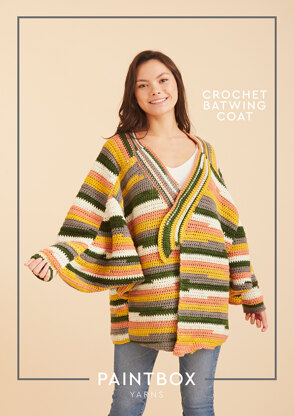 The perfect grab & go jacket! Paintbox Yarns Crochet Batwing Coat is a super cosy jacket that you can curl up in with your jeans or over your PJs at home! Crocheted using Paintbox Yarns Chunky Pots for a random super stripe effect, you can crochet happily with no colour change ends to sew in, and there are 15 shades to choose from - or work up one of these batwing wonders in a solid colour using Paintbox Yarns Simply Chunky!